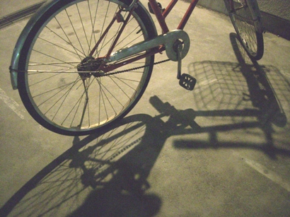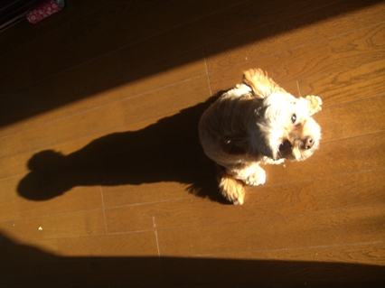 日常ふとした光景に会う事がありますが、その中でコントラストがハッキリした「影」は良いですネエ。左は夜遅く通りがかった道路で取った自転車の「影」で、右は子犬モモちゃんが朝日を仰いでいる時の「影」です。忙しい毎日ですが、時々カメラを向けて、ホッと一息入れています。 |